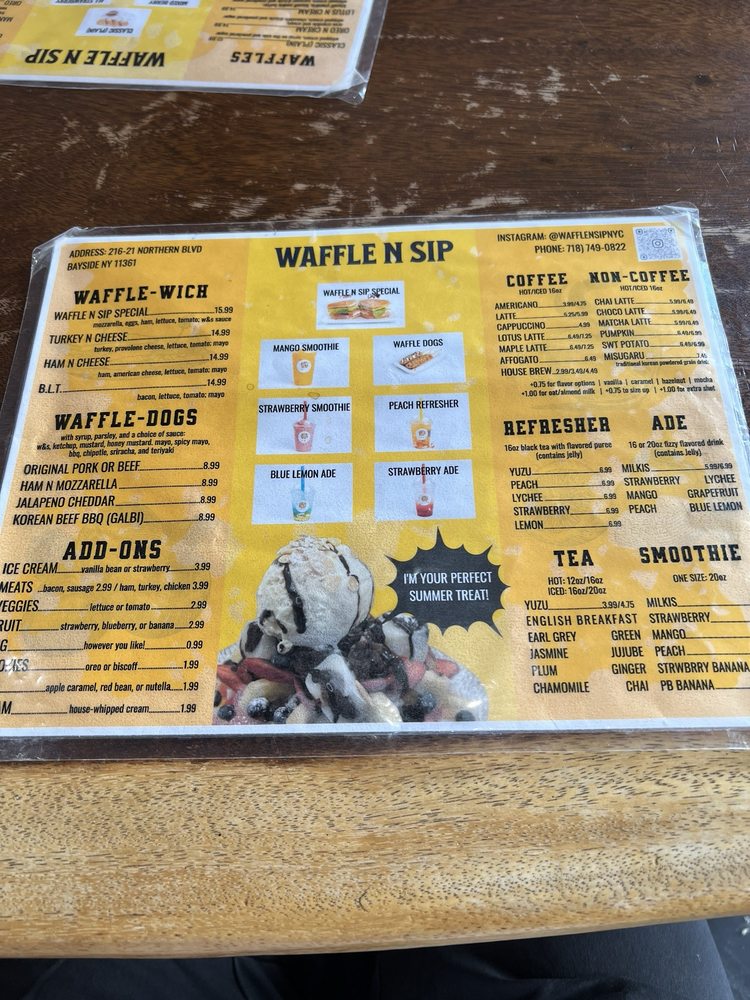 Welcome to Waffle N Sip, a cozy waffle cafe located in Queens, NY! This charming spot offers a variety of waffles, bingsu, breakfast sandwiches, and more. Known for their delicious coffee and scrumptious waffles, Waffle N Sip has impressed customers with their outstanding customer service and cute mom-and-pop atmosphere. The menu includes unique items like Korean Beef Waffle Dog and Croffle with eggs and sausages, as well as classic favorites like crisp and light waffles with various toppings. The cafe also caters to families, with a kid-friendly environment and convenient street parking. Whether you're dining in or taking out, Waffle N Sip is a must-visit for a delightful breakfast or brunch experience.
